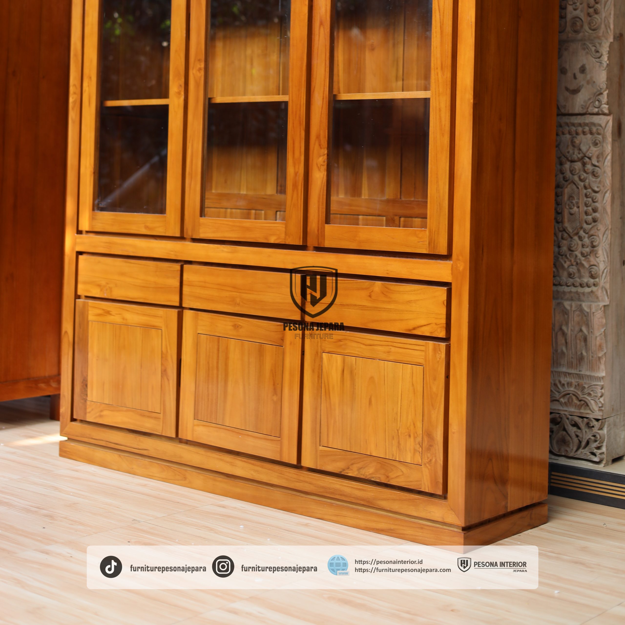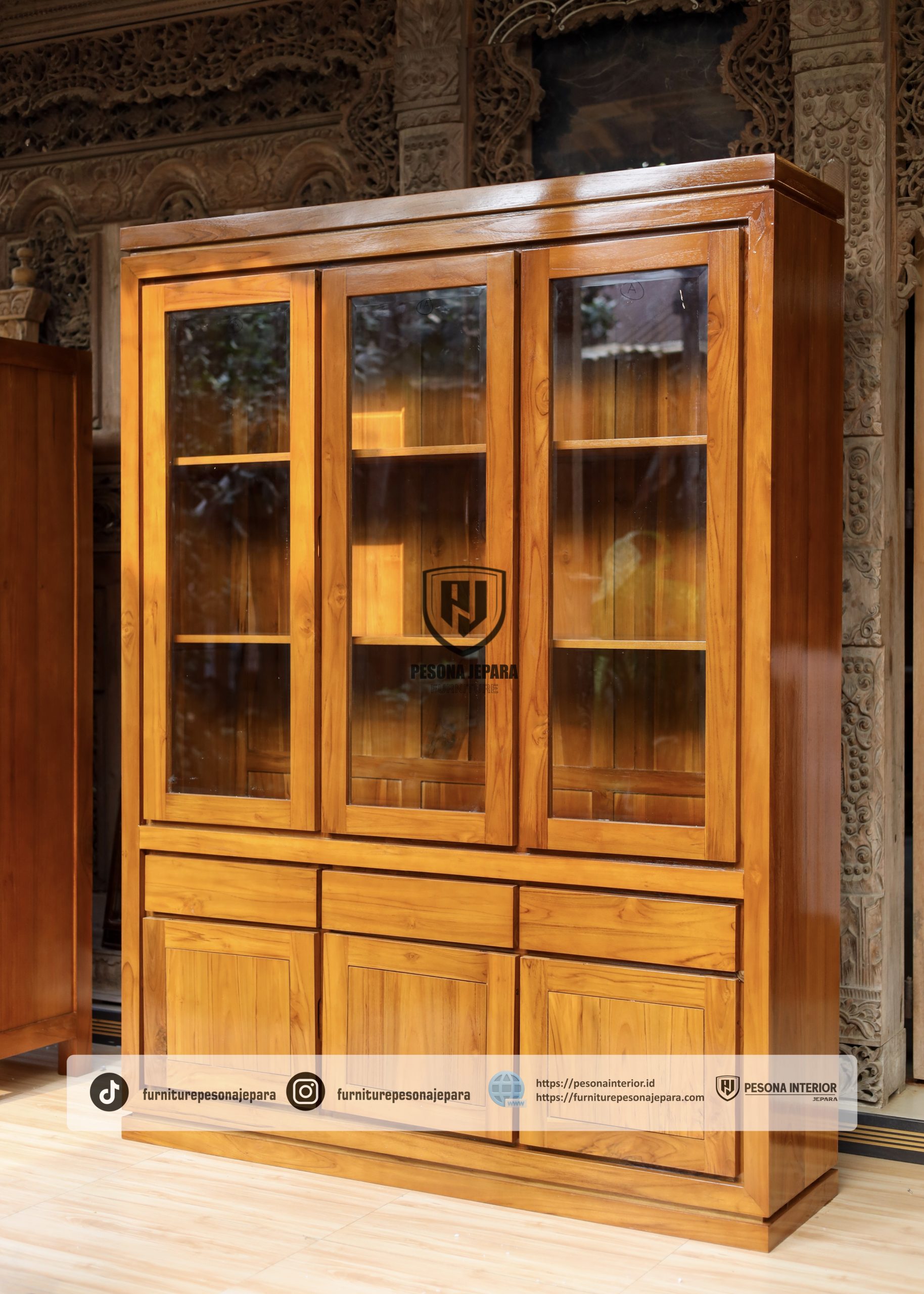 Almari Hias Kaca 3 Pintu dari Pesona Jepara bukan hanya sekadar tempat penyimpanan, tapi juga menjadi elemen dekoratif yang meningkatkan estetika ruangan Anda. Hadirkan nuansa mewah dan natural dengan kualitas terbaik dari pengrajin Jepara.