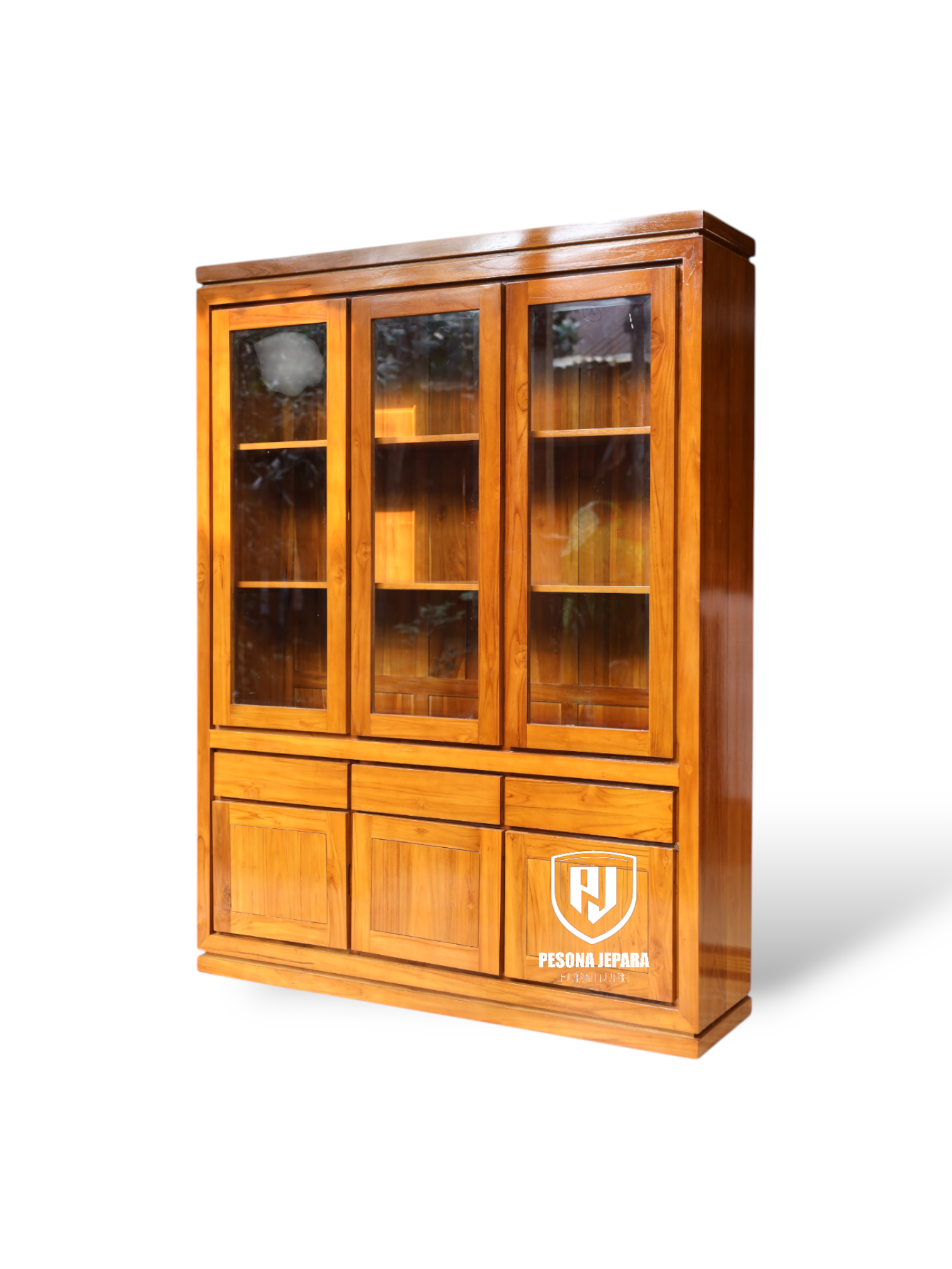 Tampilkan koleksi terbaik Anda dengan keanggunan maksimal melalui Almari Hias Kaca 3 Pintu dari Pesona Jepara. Dibuat dari kayu jati solid pilihan, almari ini dirancang untuk memadukan keindahan klasik dengan fungsionalitas modern. Dengan tiga pintu kaca bening dan penyimpanan bawah yang tertutup, produk ini sangat cocok untuk ruang tamu, ruang keluarga, atau ruang kerja bergaya elegan.