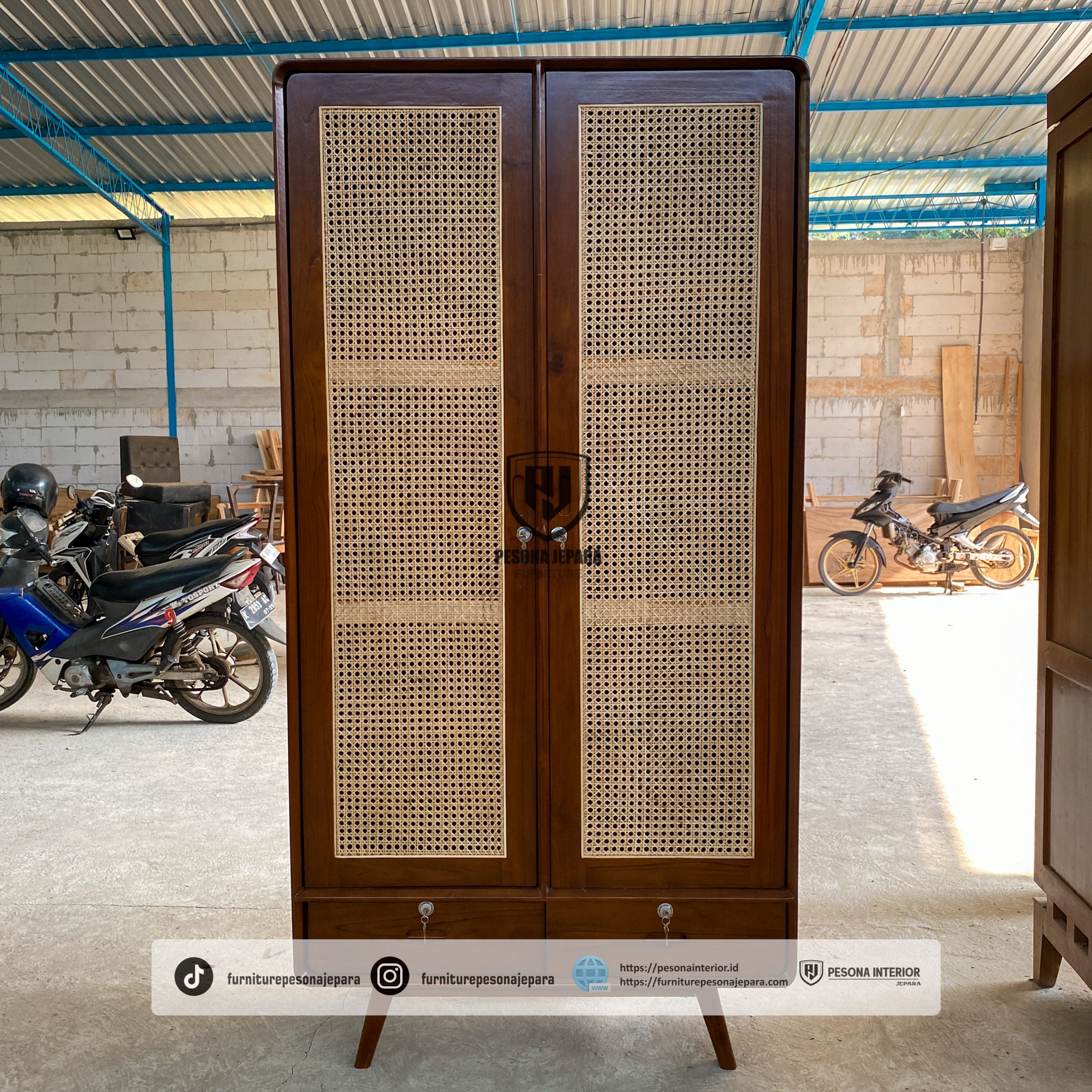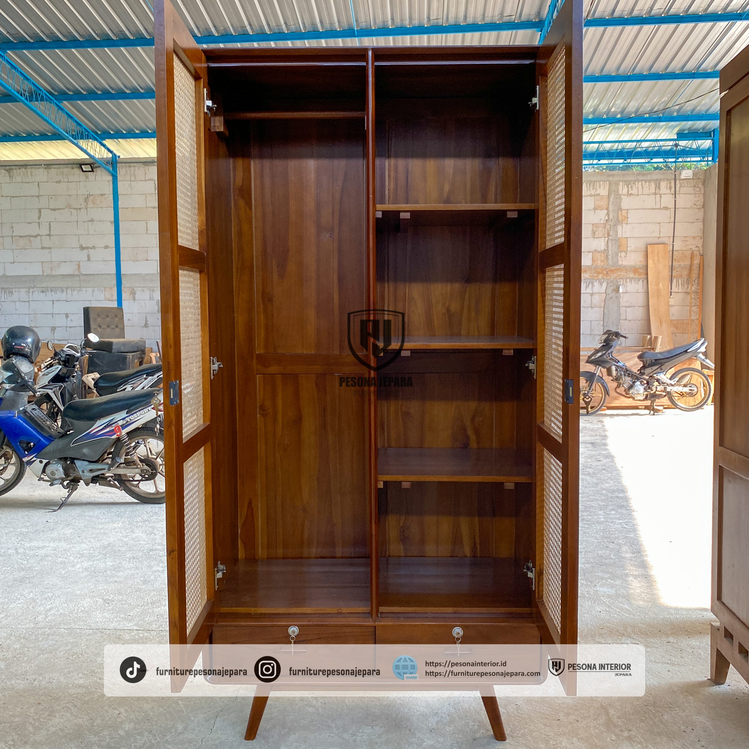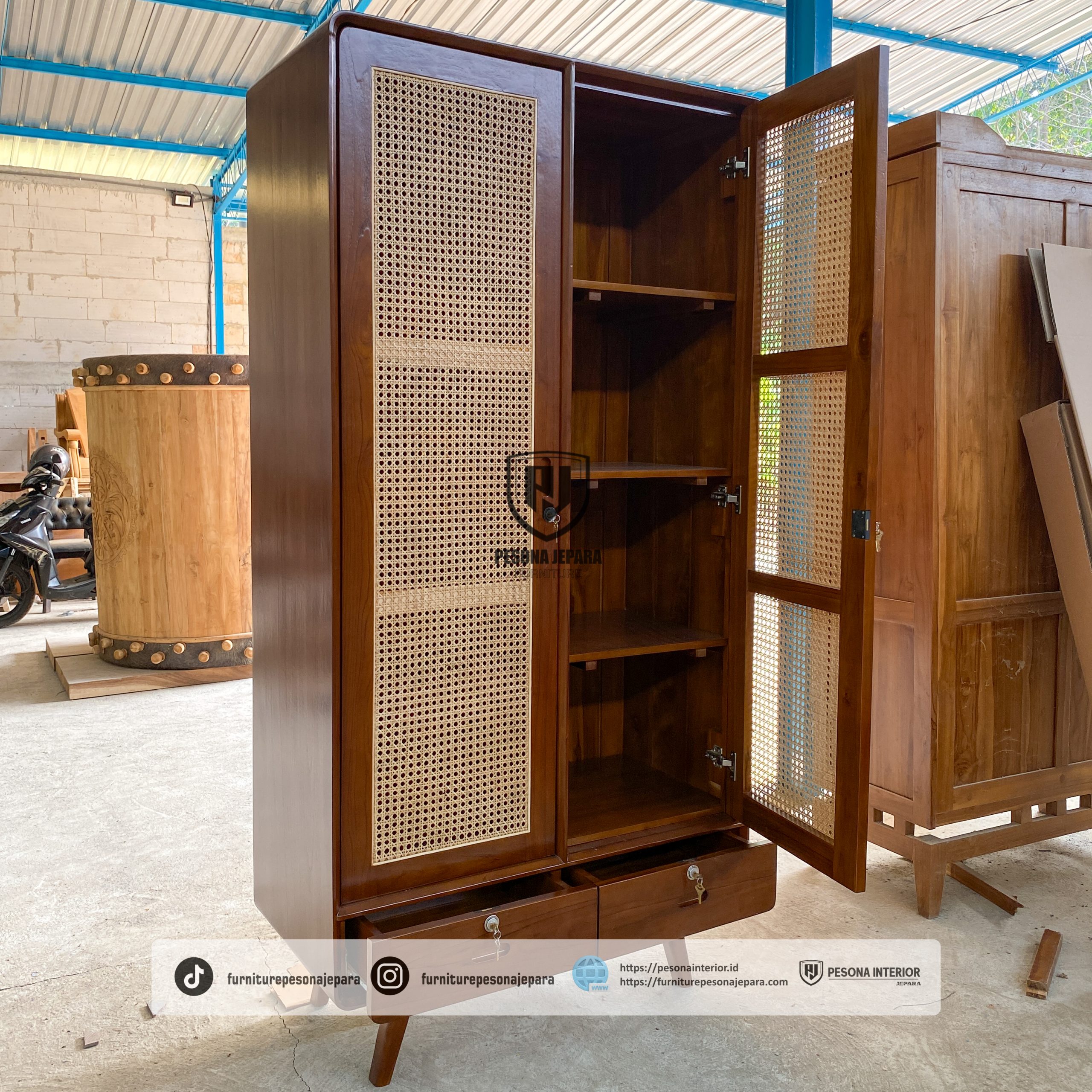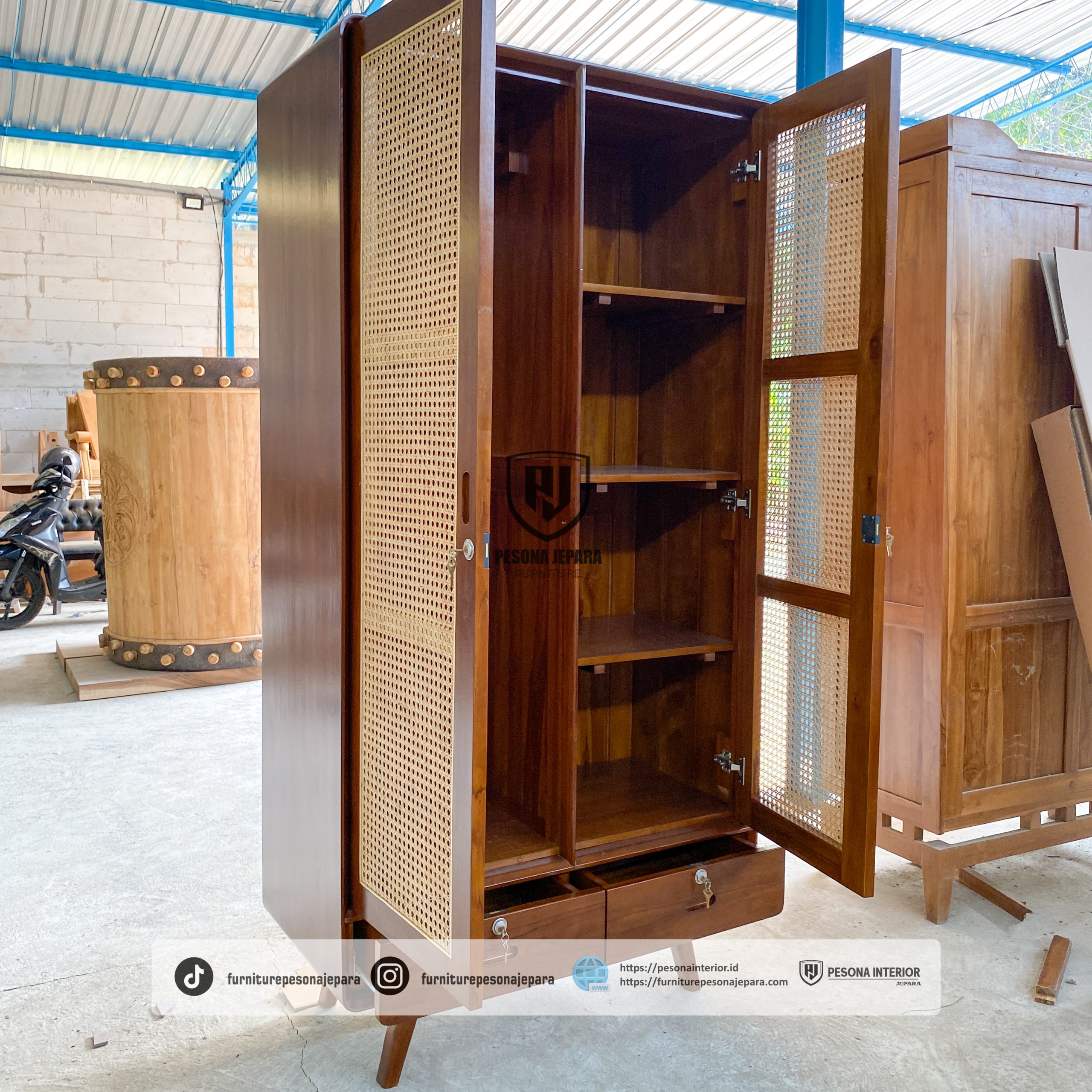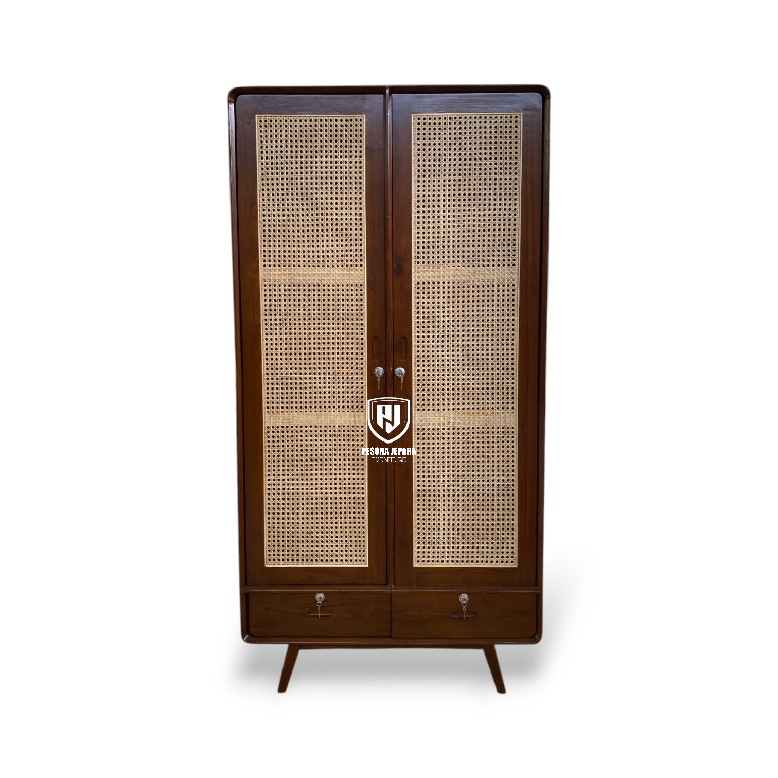 Bagian pintu almari menggunakan detail anyaman rotan alami yang khas, memberikan sentuhan klasik sekaligus memastikan sirkulasi udara tetap terjaga di dalamnya. Hal ini membuat pakaian dan barang-barang tetap segar, tidak lembap, dan bebas bau apek. Material rotan yang dipadukan dengan kayu solid menciptakan harmoni alami yang timeless, cocok dipadukan dengan berbagai gaya interior mulai dari vintage, skandinavia, hingga kontemporer.
