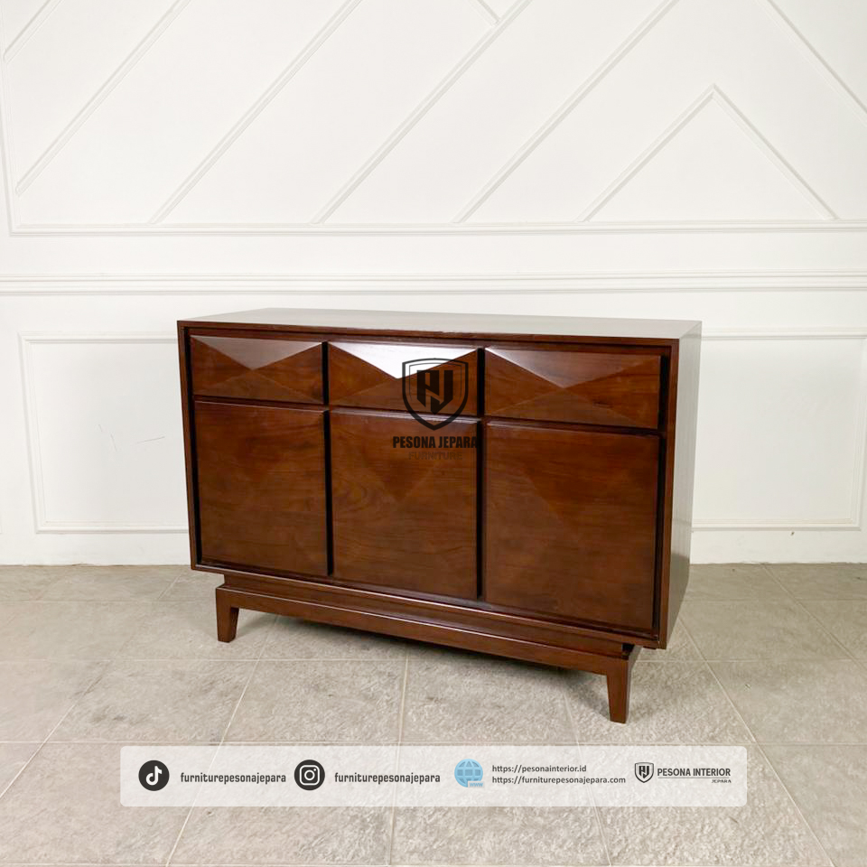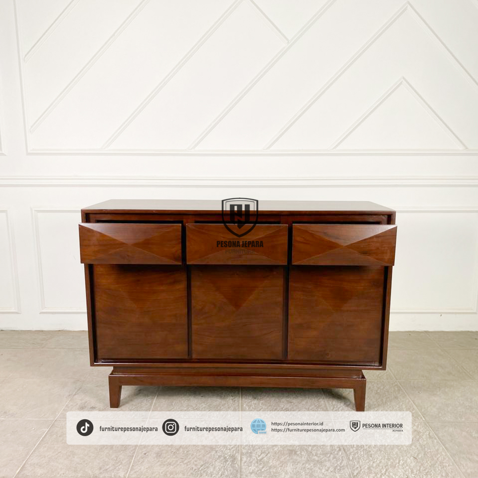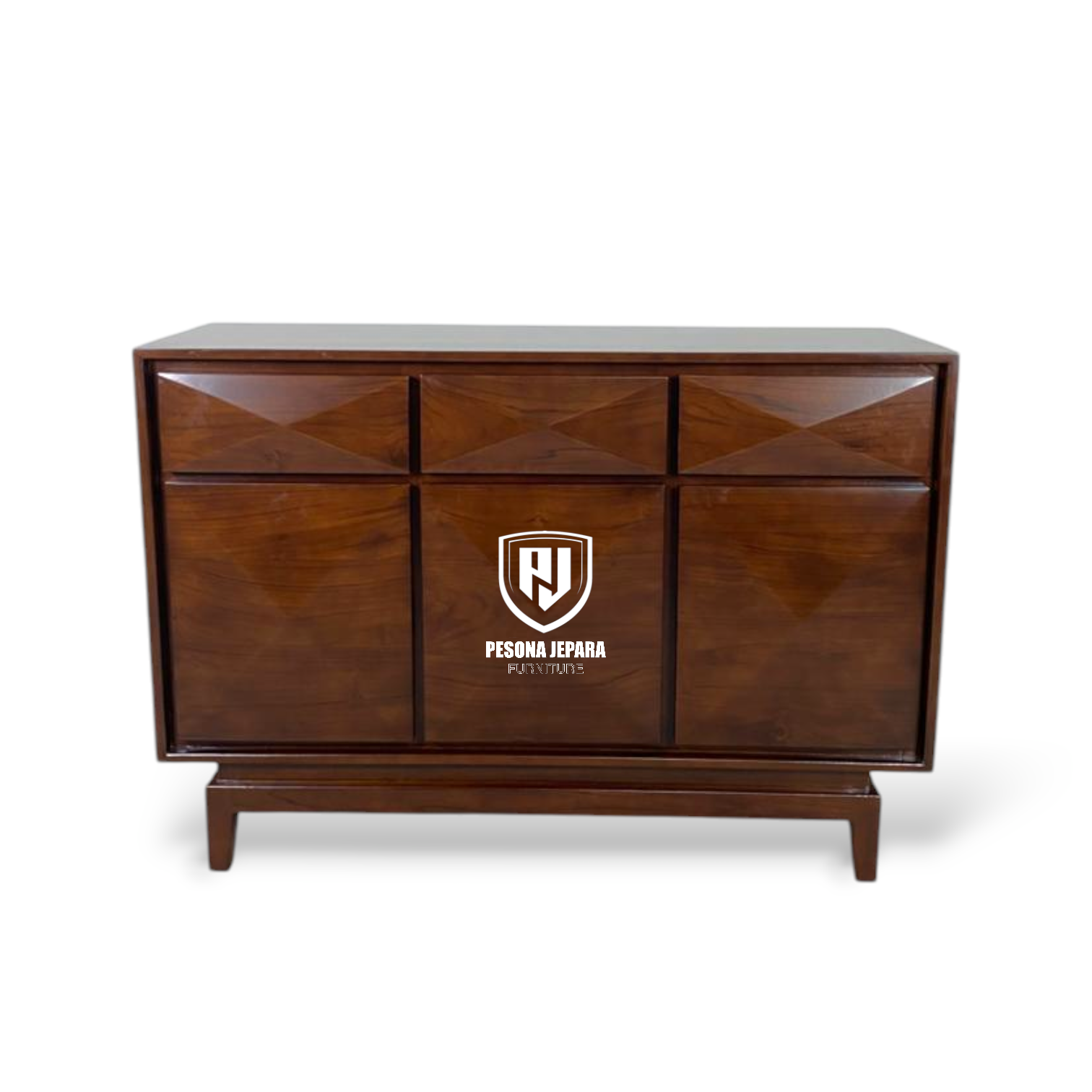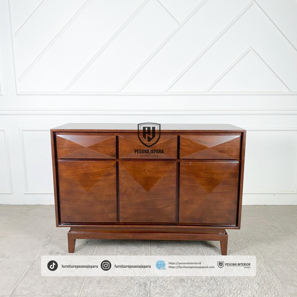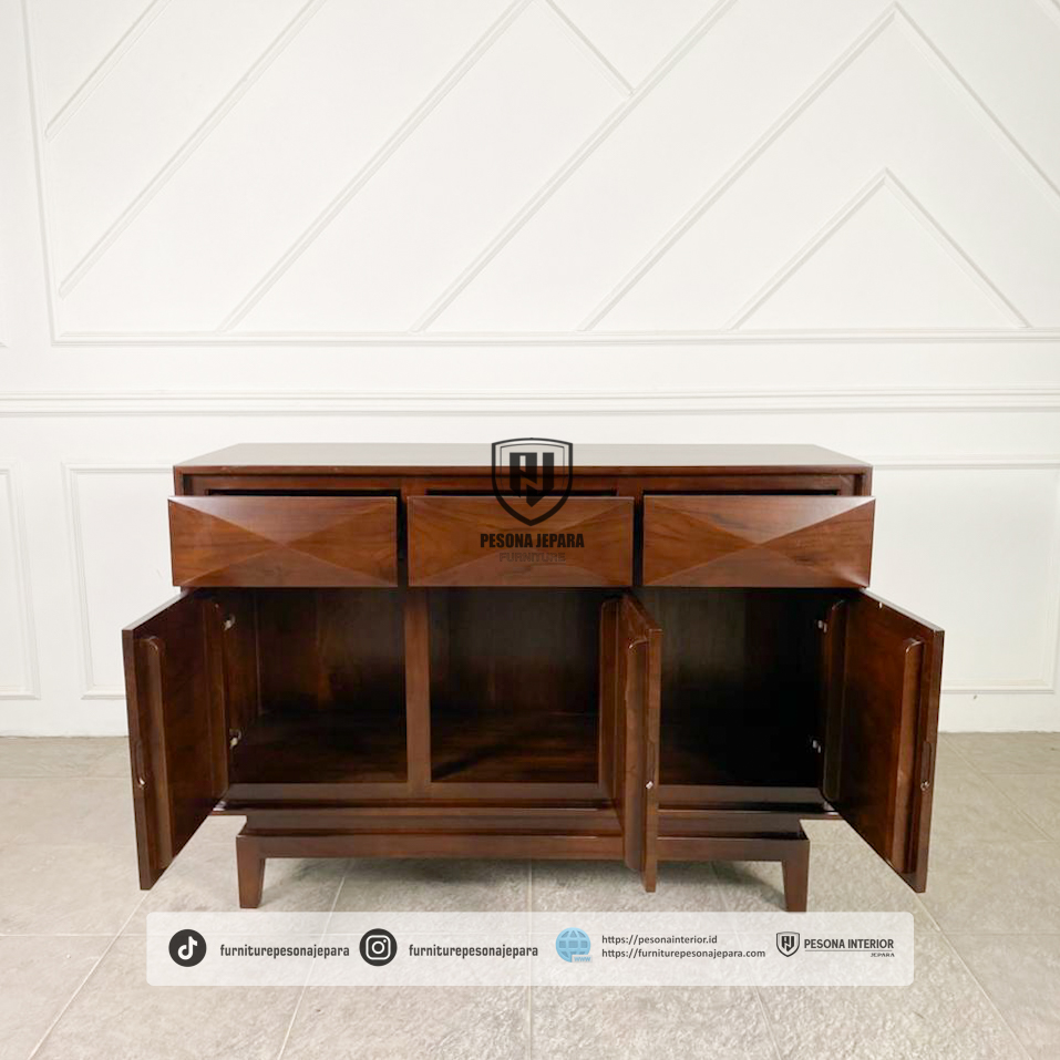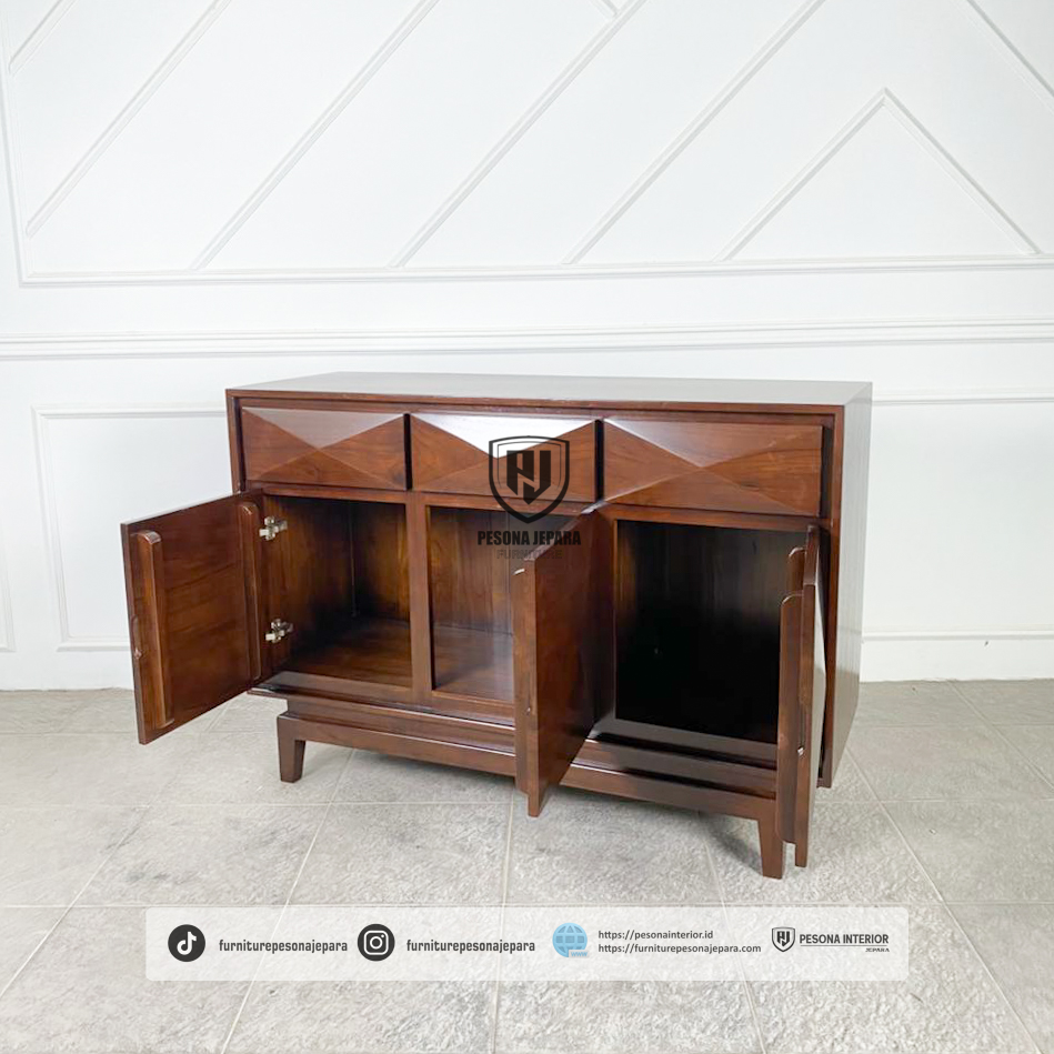 Keistimewaan dari bufet ini terletak pada pola geometris berbentuk diamond di bagian pintu dan laci, yang memberikan kesan artistik sekaligus unik. Desain ini menjadikan Bufet Diamond Gen 2 bukan hanya sebagai tempat penyimpanan, tetapi juga sebagai elemen dekoratif yang mempercantik ruangan.