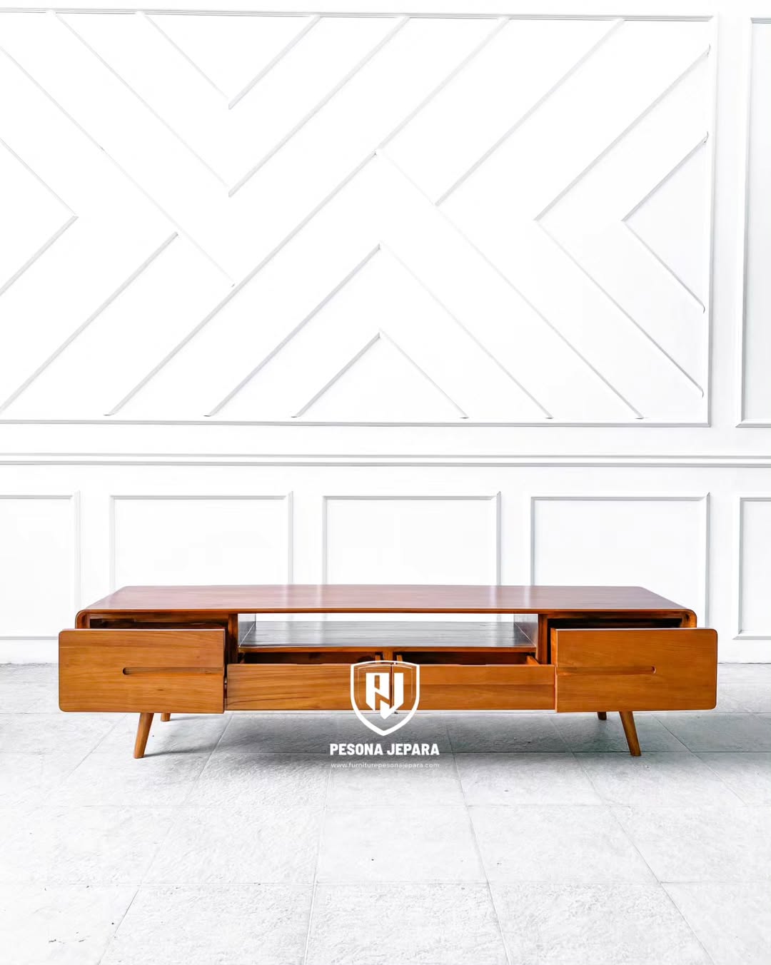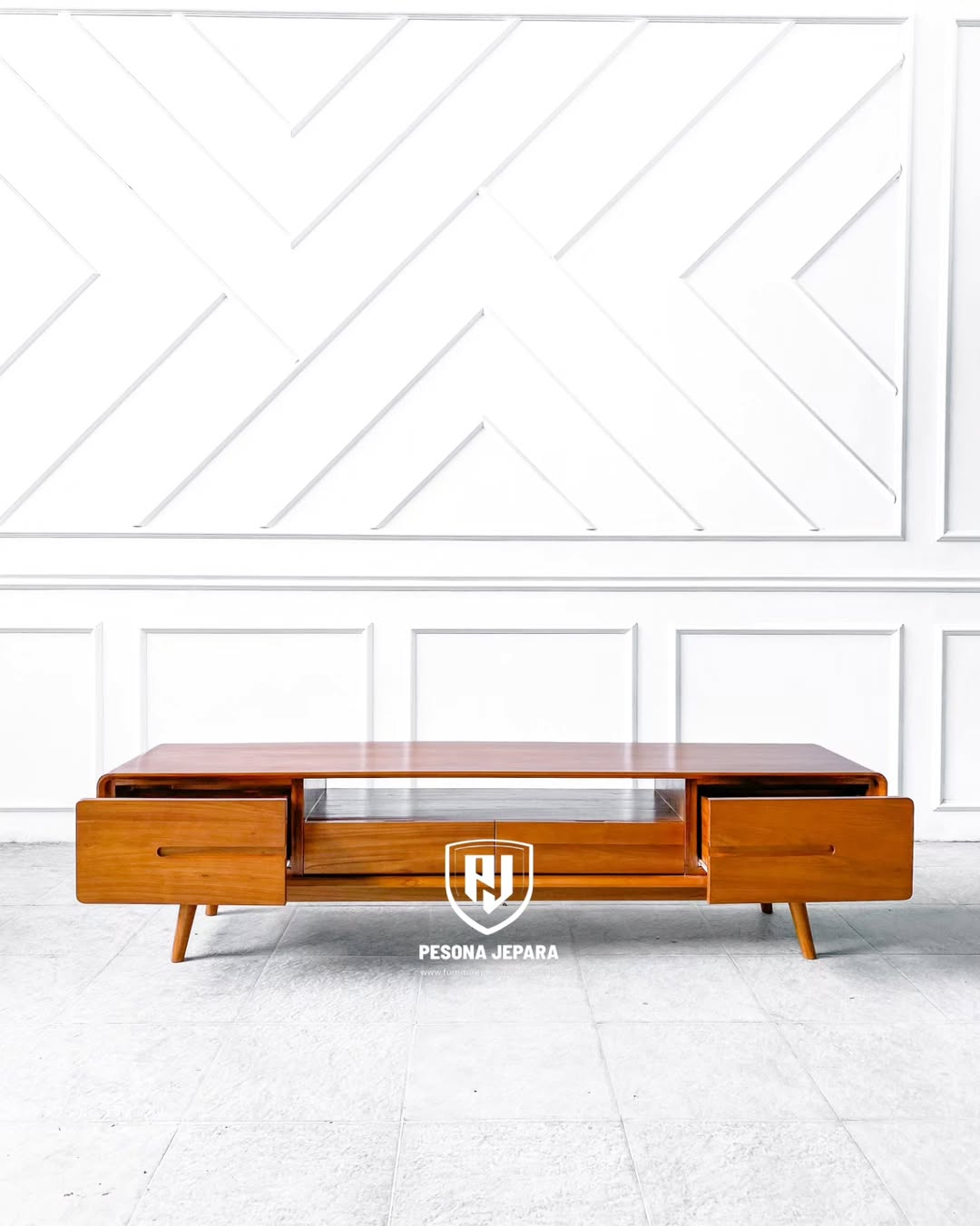 Ciptakan ruang keluarga yang nyaman dan berkelas dengan Bufet TV Lesehan Model Retro. Dengan desain yang memanjang dan rendah (low profile), bufet ini sangat cocok untuk mendukung TV berukuran besar sekaligus memberikan kesan ruangan yang lebih luas dan lapang.