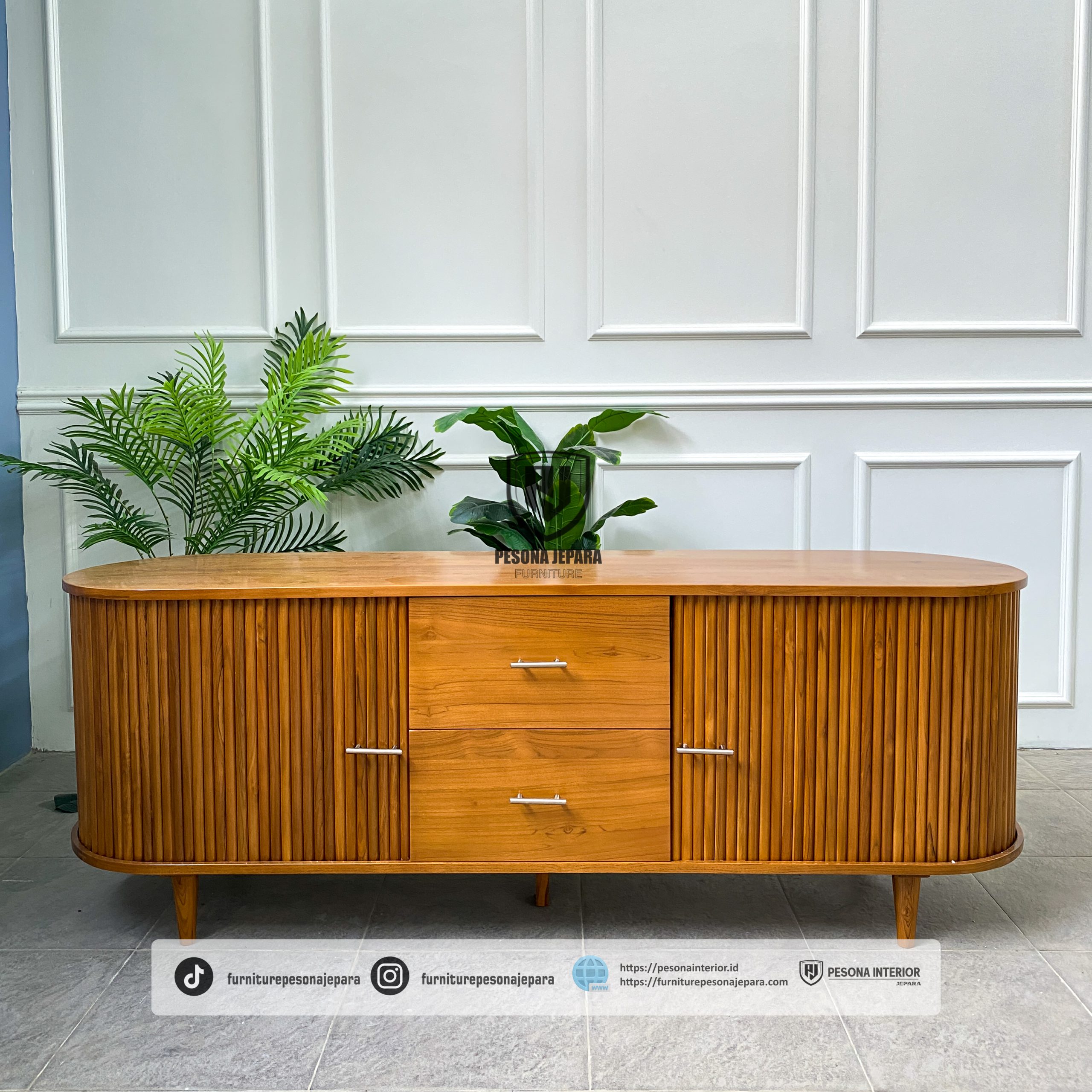 Bufet ini memiliki ciri khas berupa pintu kabinet dengan finishing pola salur vertikal yang memberikan kesan dinamis dan modern. Bentuknya yang melengkung pada sisi samping menghadirkan nuansa lembut sekaligus artistik, menjadikannya pusat perhatian dalam ruang tamu maupun ruang keluarga.
