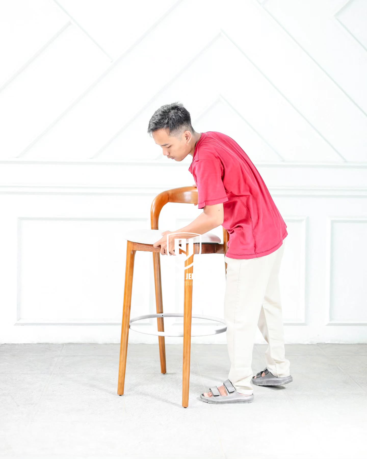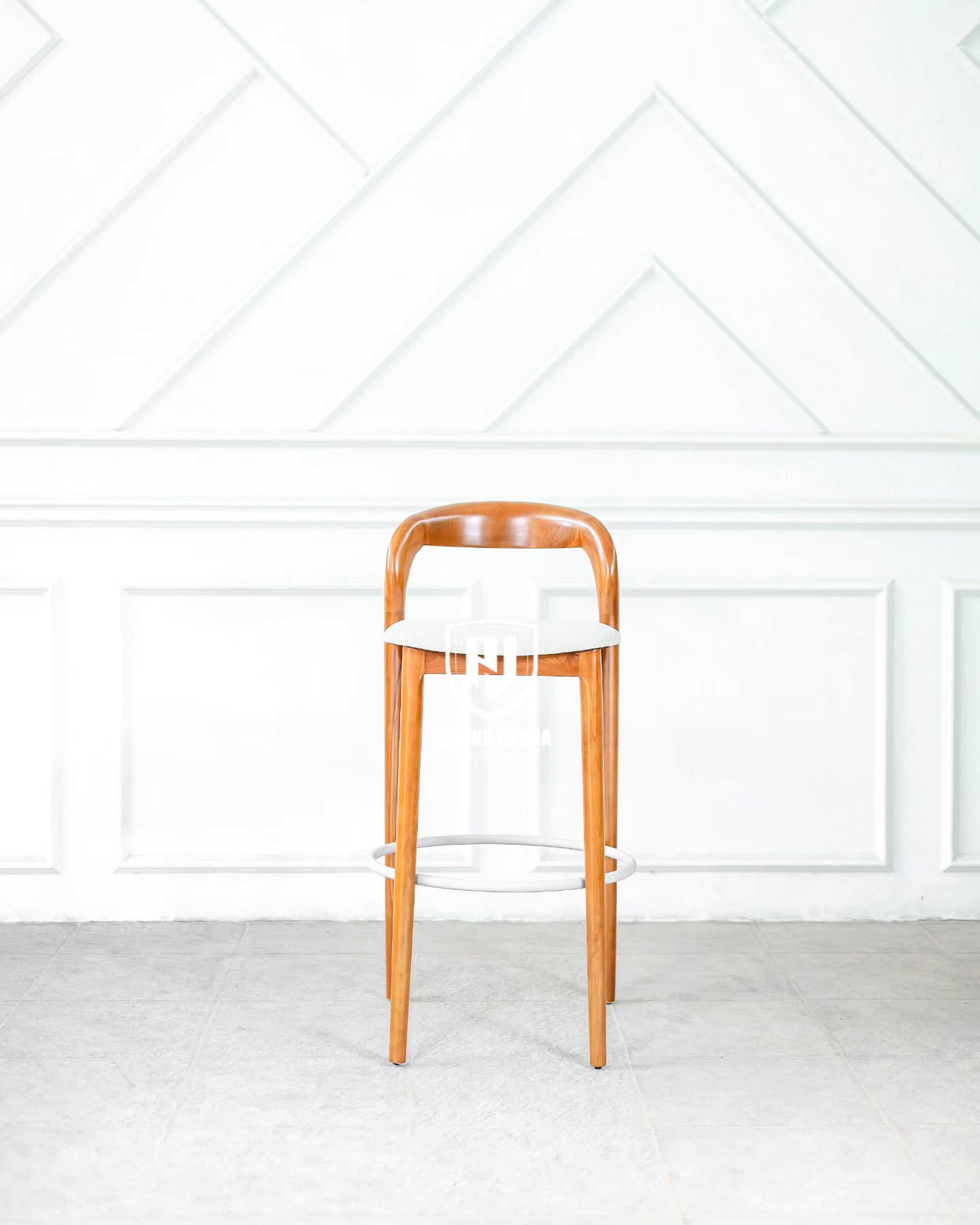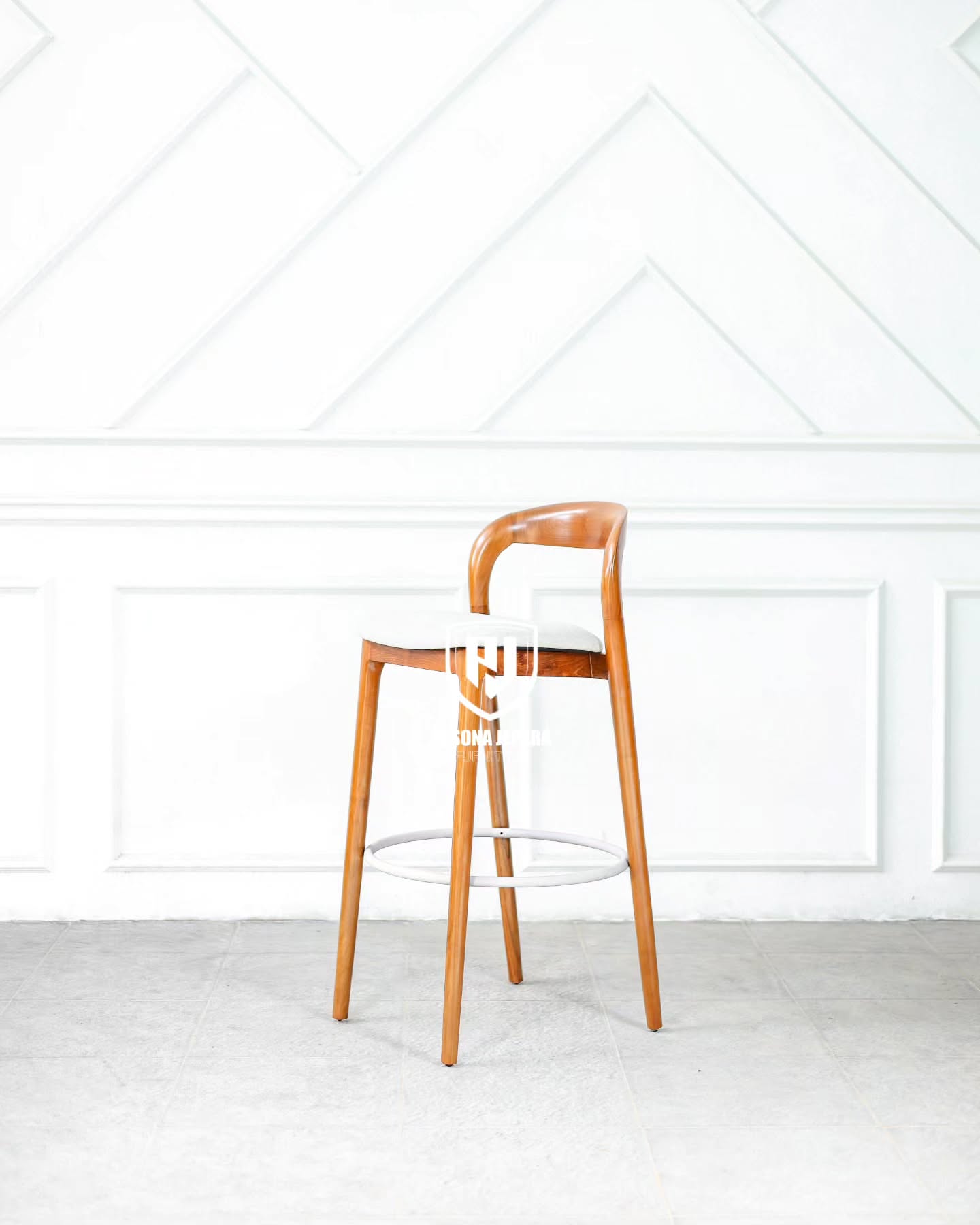 Desain kaki kursi dibuat tinggi dan ramping, menjadikannya sempurna untuk meja bar, kitchen island, atau kafe bergaya rustic-modern. Dudukannya dibuat sedikit melengkung mengikuti bentuk tubuh, memberikan kenyamanan ekstra tanpa mengorbankan gaya.