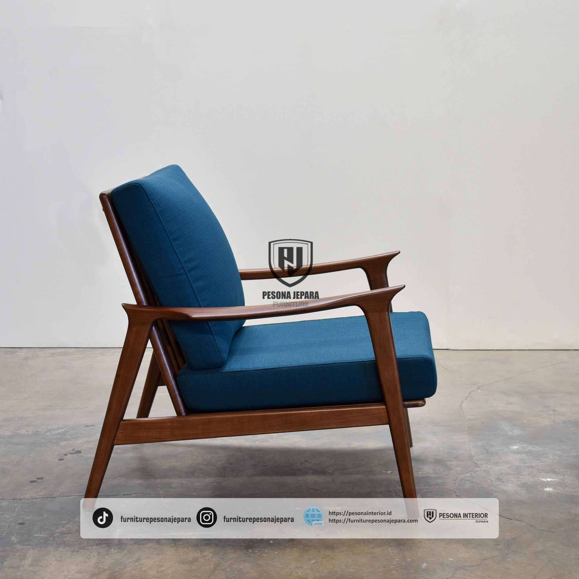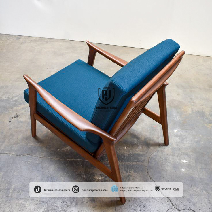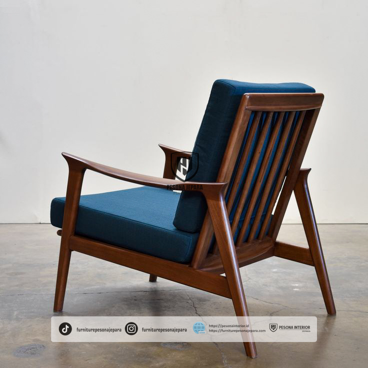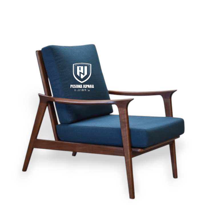 Desain armrest yang ergonomis memberikan kenyamanan ekstra saat duduk, sementara dudukan dan sandaran busa tebal membuat Anda bisa berlama-lama menikmati waktu istirahat. Warna kayu natural dipadukan dengan jok kain berwarna biru elegan, menciptakan tampilan modern yang cocok dipadukan dengan berbagai dekorasi rumah, baik untuk teras, ruang tamu, maupun ruang baca pribadi.