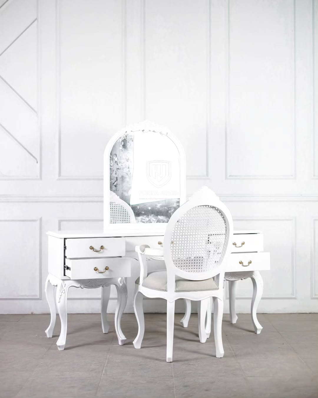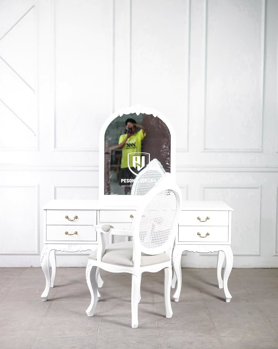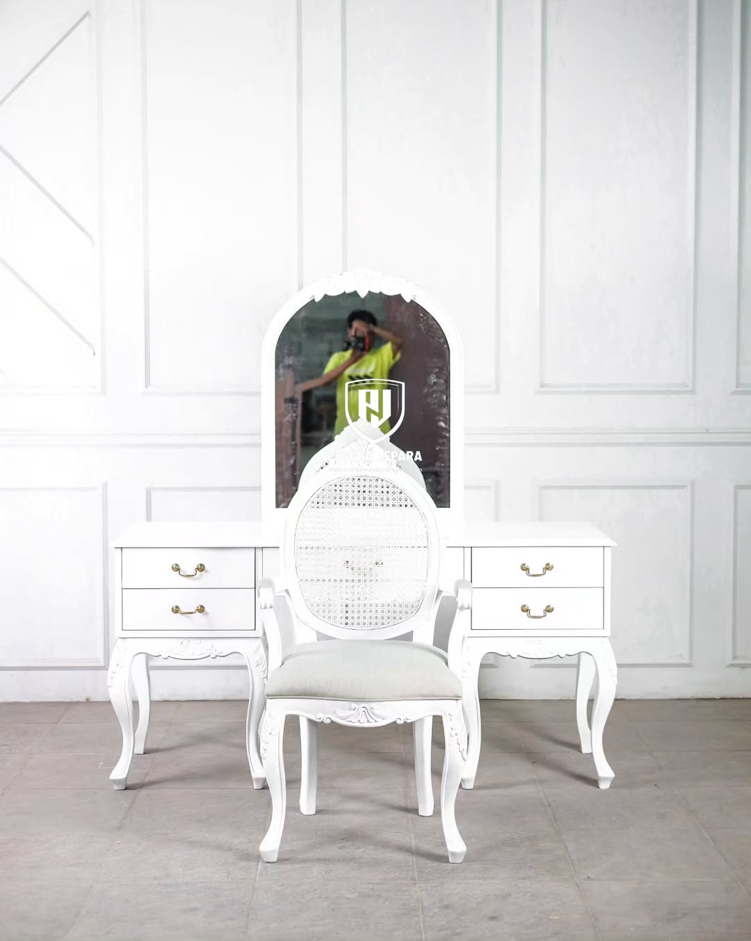 Meja Rias Duco Klasik ini merupakan furnitur eksklusif yang dirancang untuk menghadirkan nuansa mewah dan romantis pada ruang kamar Anda. Mengusung gaya klasik Eropa yang elegan, meja rias ini memadukan ukiran lembut, lekukan kaki yang anggun, dan finishing duco putih yang memberikan tampilan bersih, cerah, serta berkelas.