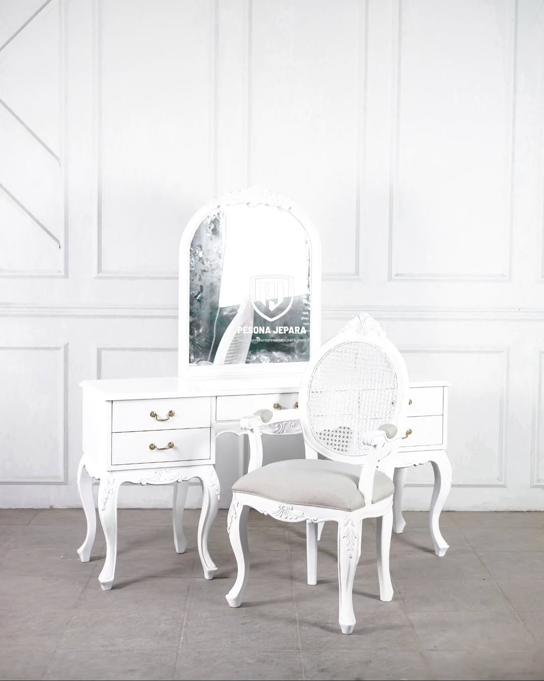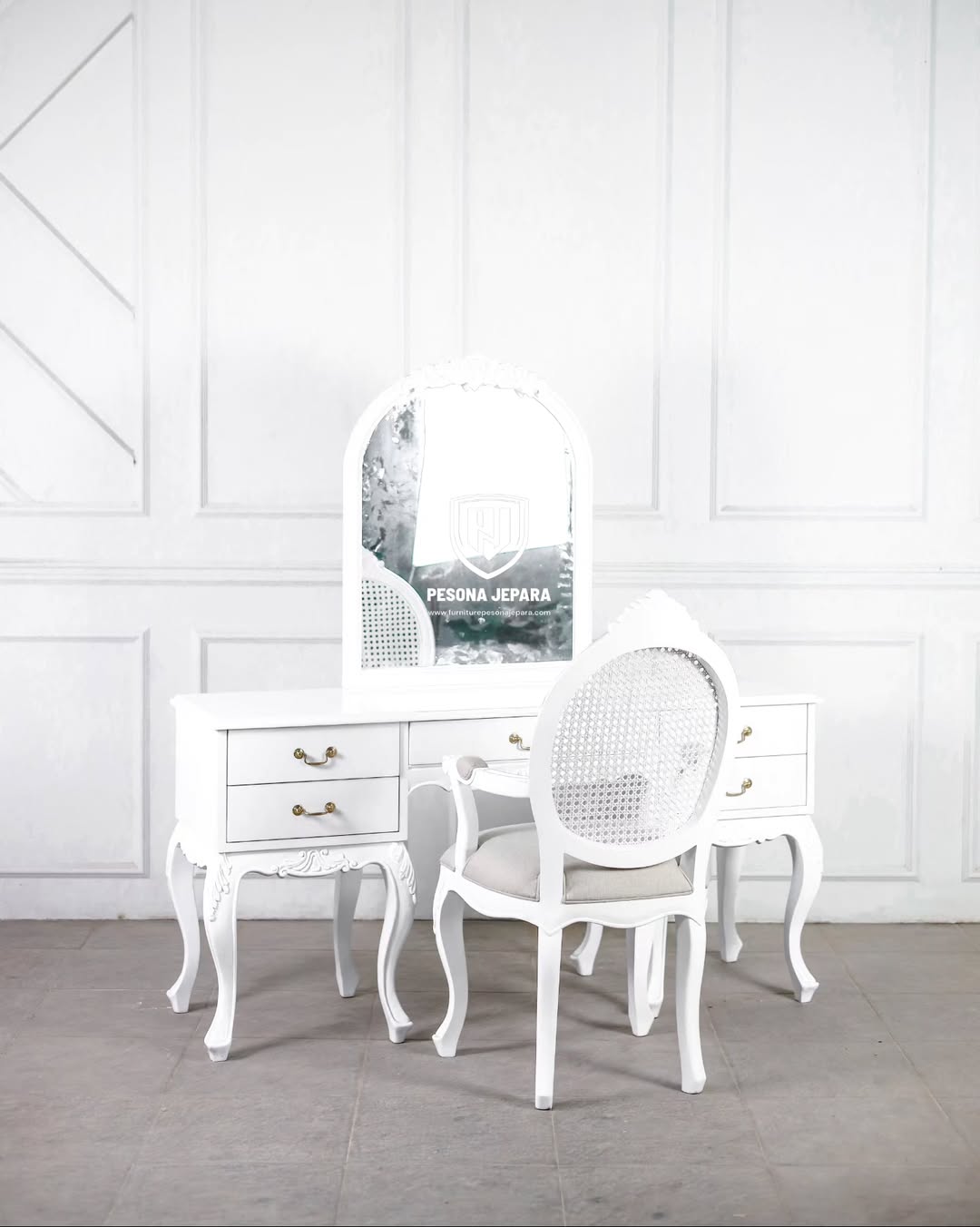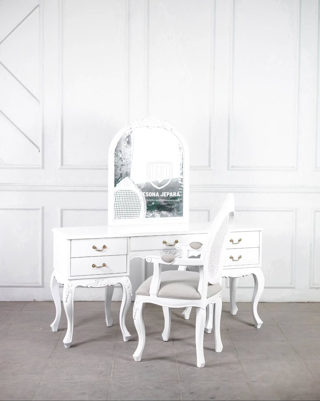 Meja Rias Duco Klasik ini merupakan furnitur eksklusif yang dirancang untuk menghadirkan nuansa mewah dan romantis pada ruang kamar Anda. Mengusung gaya klasik Eropa yang elegan, meja rias ini memadukan ukiran lembut, lekukan kaki yang anggun, dan finishing duco putih yang memberikan tampilan bersih, cerah, serta berkelas.