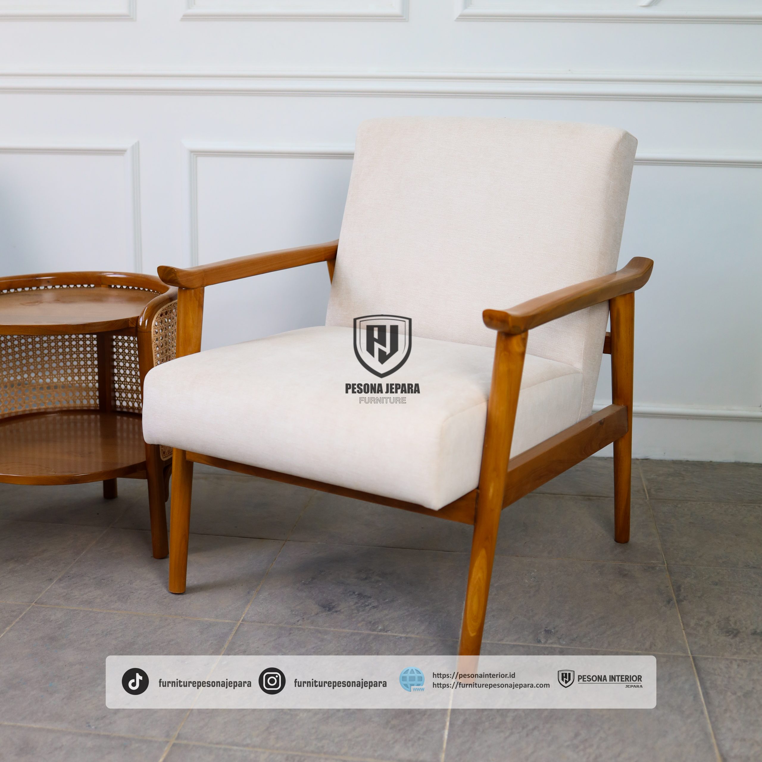 Kursi teras ini memiliki bentuk simpel namun tetap elegan. Rangka kayu jati dengan finishing natural memberikan kesan hangat dan alami, sementara sentuhan jok busa empuk yang dilapisi kain halus membuat kursi ini semakin nyaman digunakan. Desain sandaran yang agak rebah memberikan posisi duduk yang ergonomis, cocok untuk bersantai dalam waktu lama.